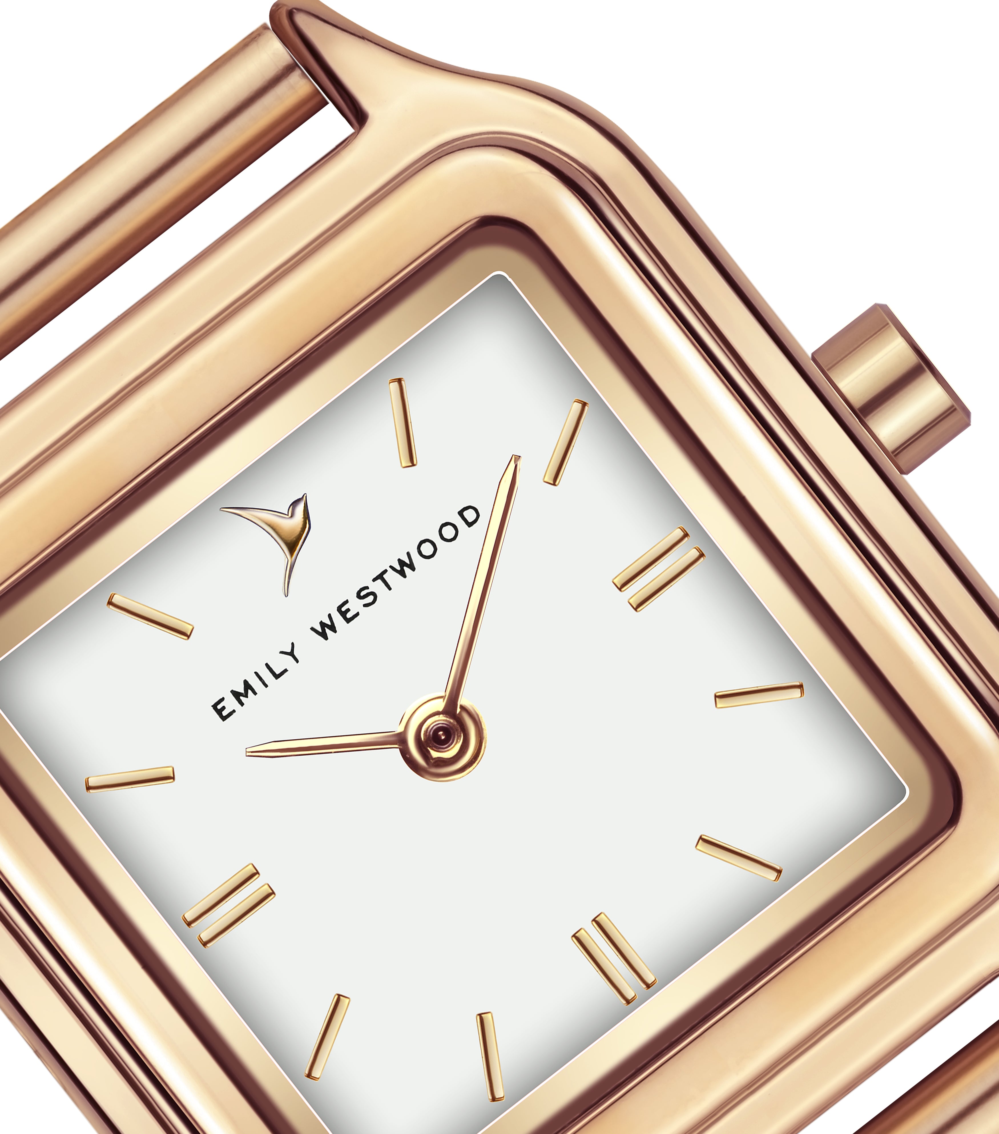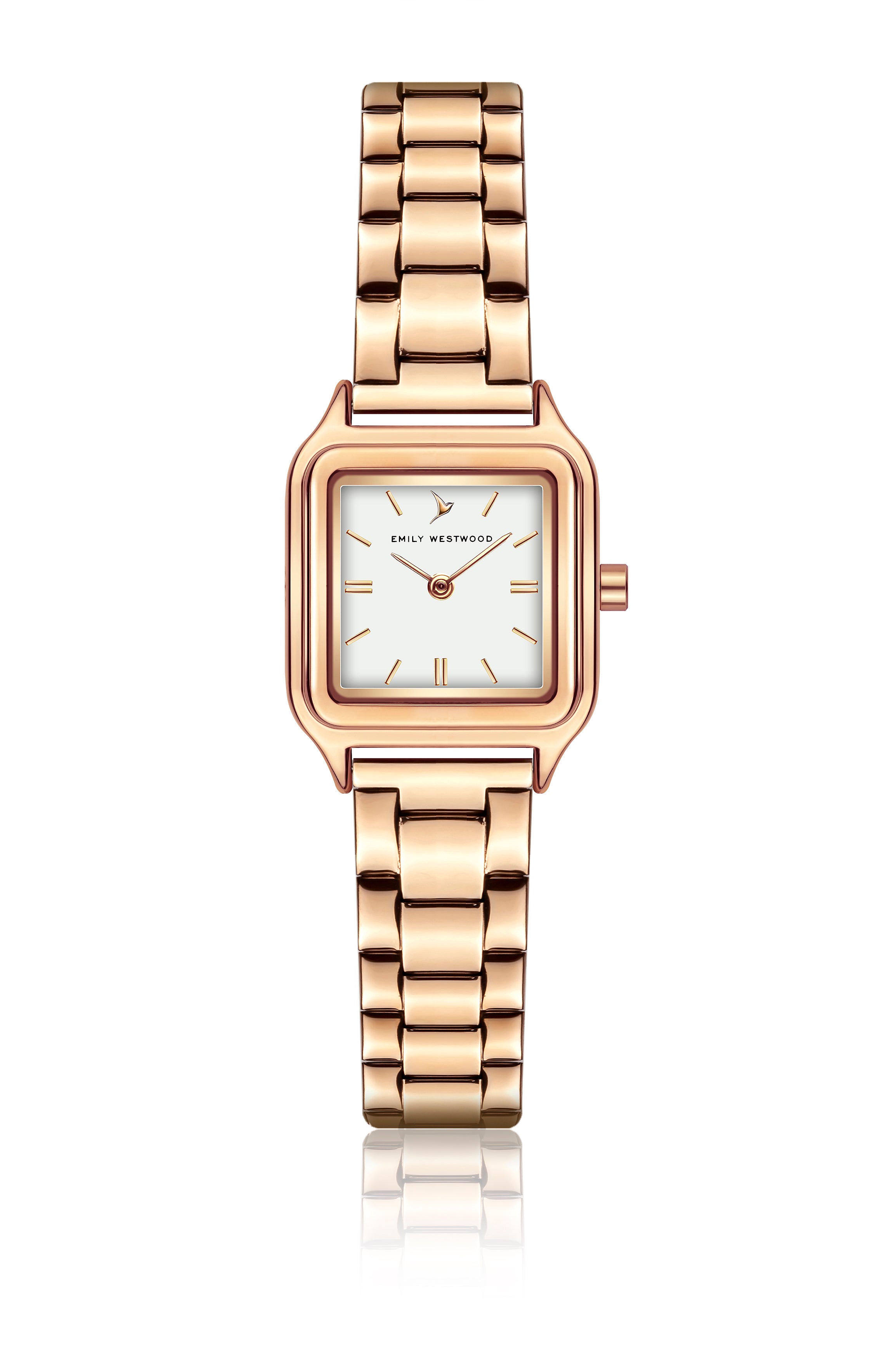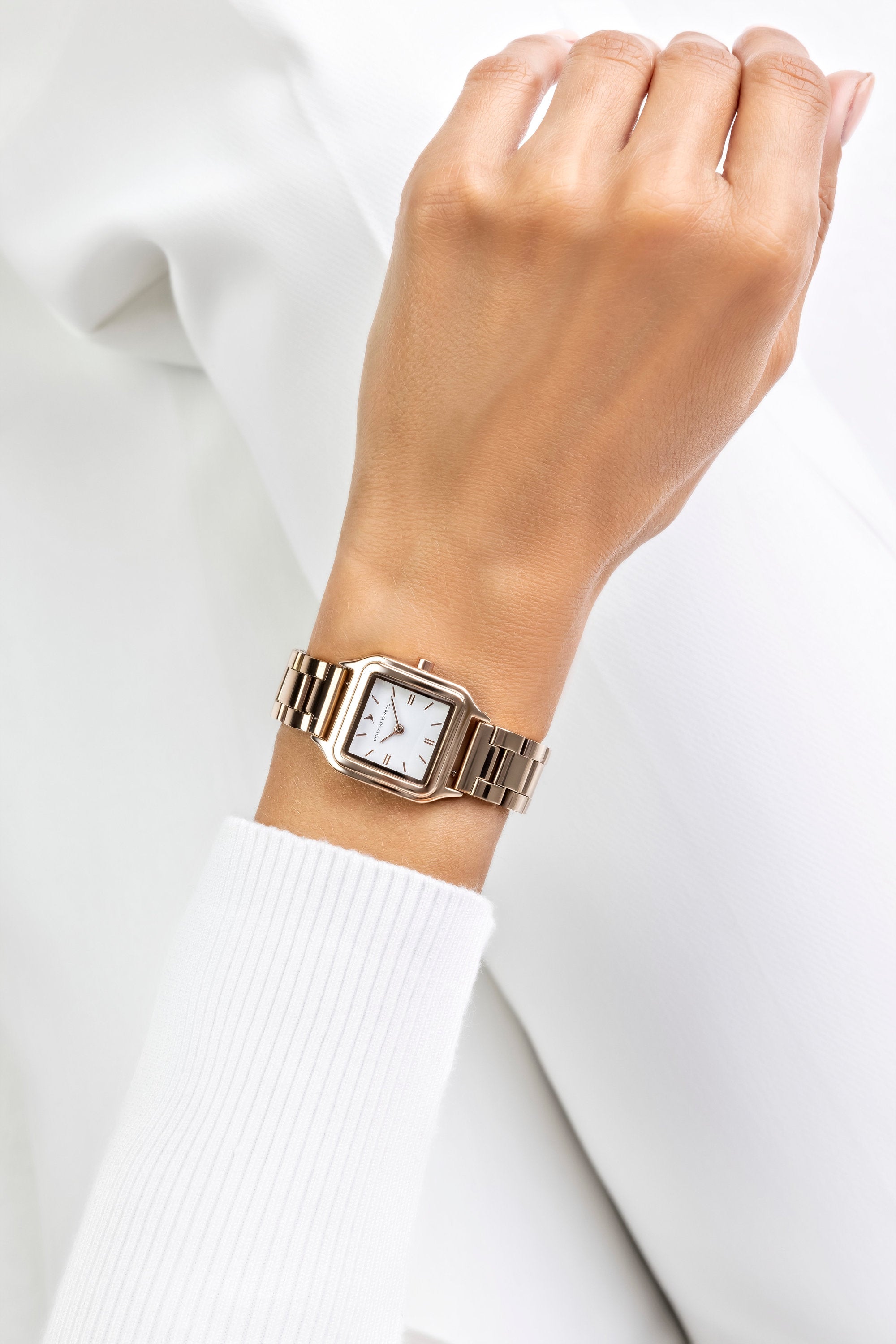 Analog armbandsklocka med japanskt kvartsurverk, härdat mineralglas och roséguldpläterat viklås i rostfritt stål med IP-plätering.