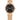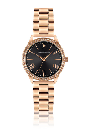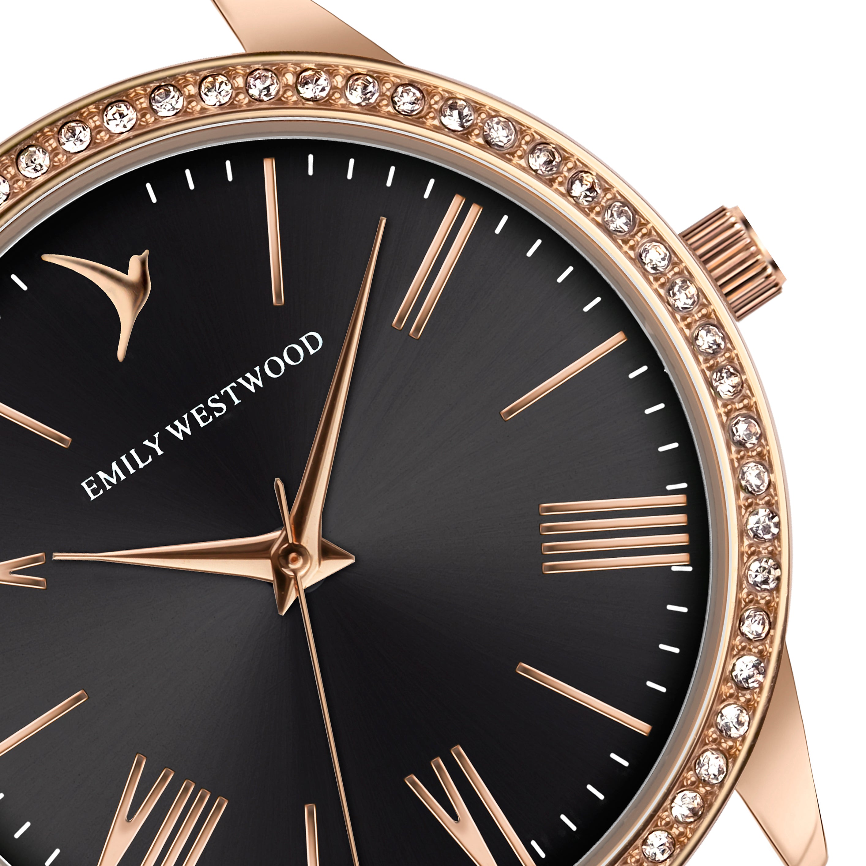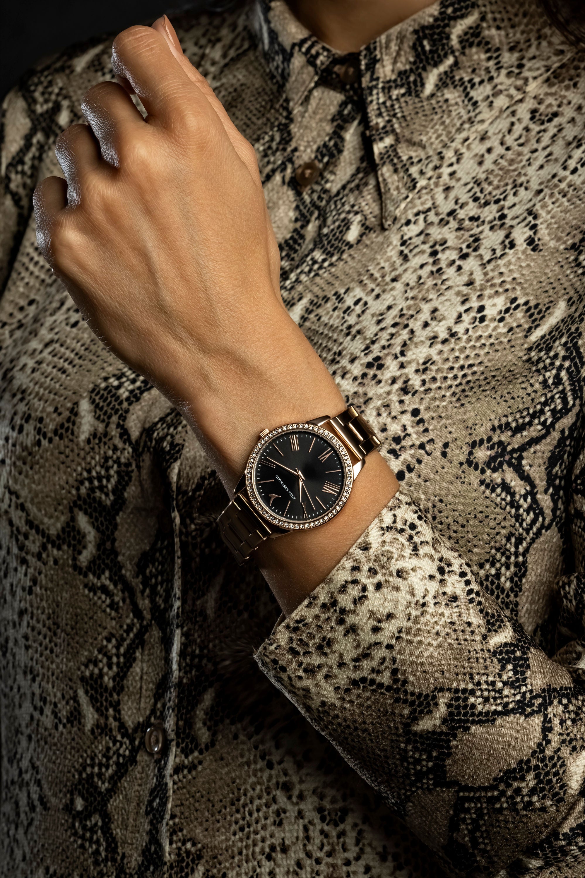 Analog armbandsklocka med Ronda-urverk, härdat mineralglas och roséguldpläterat skjutspänne i rostfritt stål med IP-plätering.