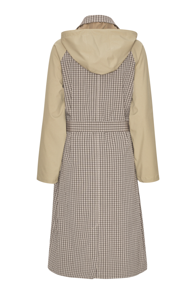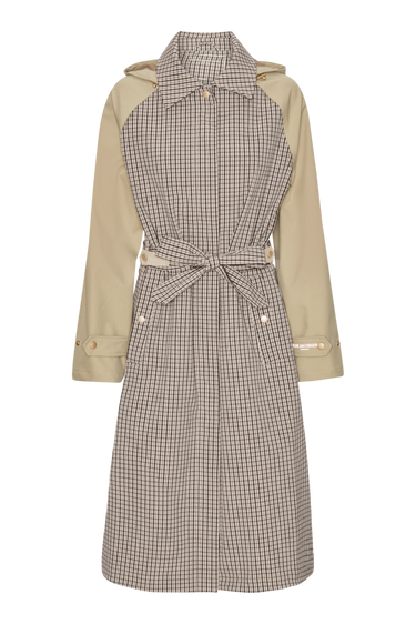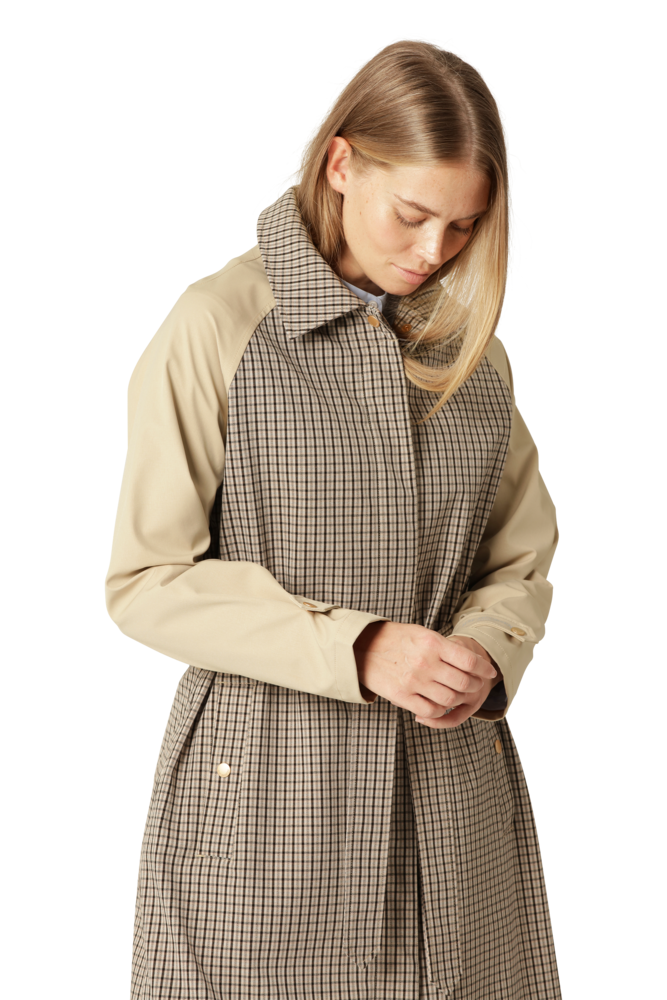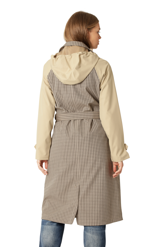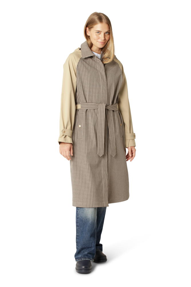 En teknisk trench-regnrock som kombinerar enfärgade ärmar med rutigt tyg i kroppen för en stilsäker kontrast. Byggd för att tåla måttliga till kraftiga regnskurar, erbjuder den 5 000 mm/3 000 g/m² skydd. Tyget är behandlat med Ecorepel® för att stöta bort smuts och vatten. Vind- och vattentät men ändå andningsbar, för komfort i alla väder. Med avtagbar huva, reflekterande logotyp på vänster ärmslut och bälte förenar den säkerhet och stil.