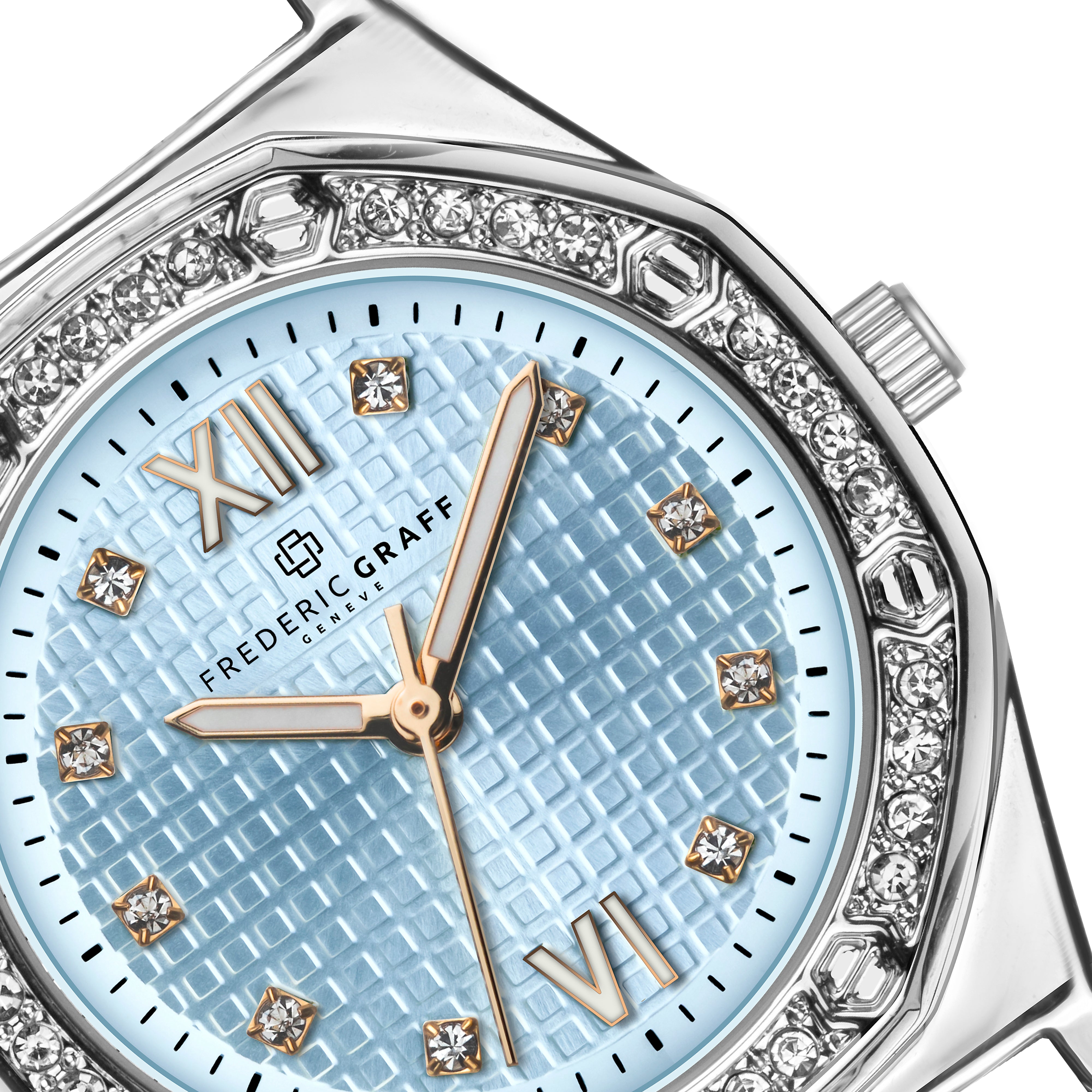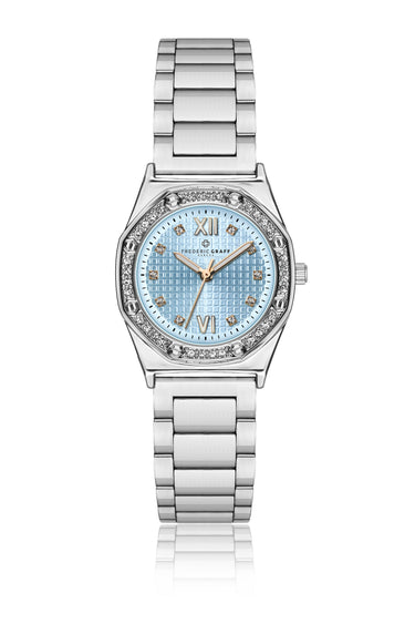Analog armbandsklocka med japanskt kvartsurverk, härdat mineralglas och silverfärgat skjutspänne i rostfritt stål med IP-plätering.