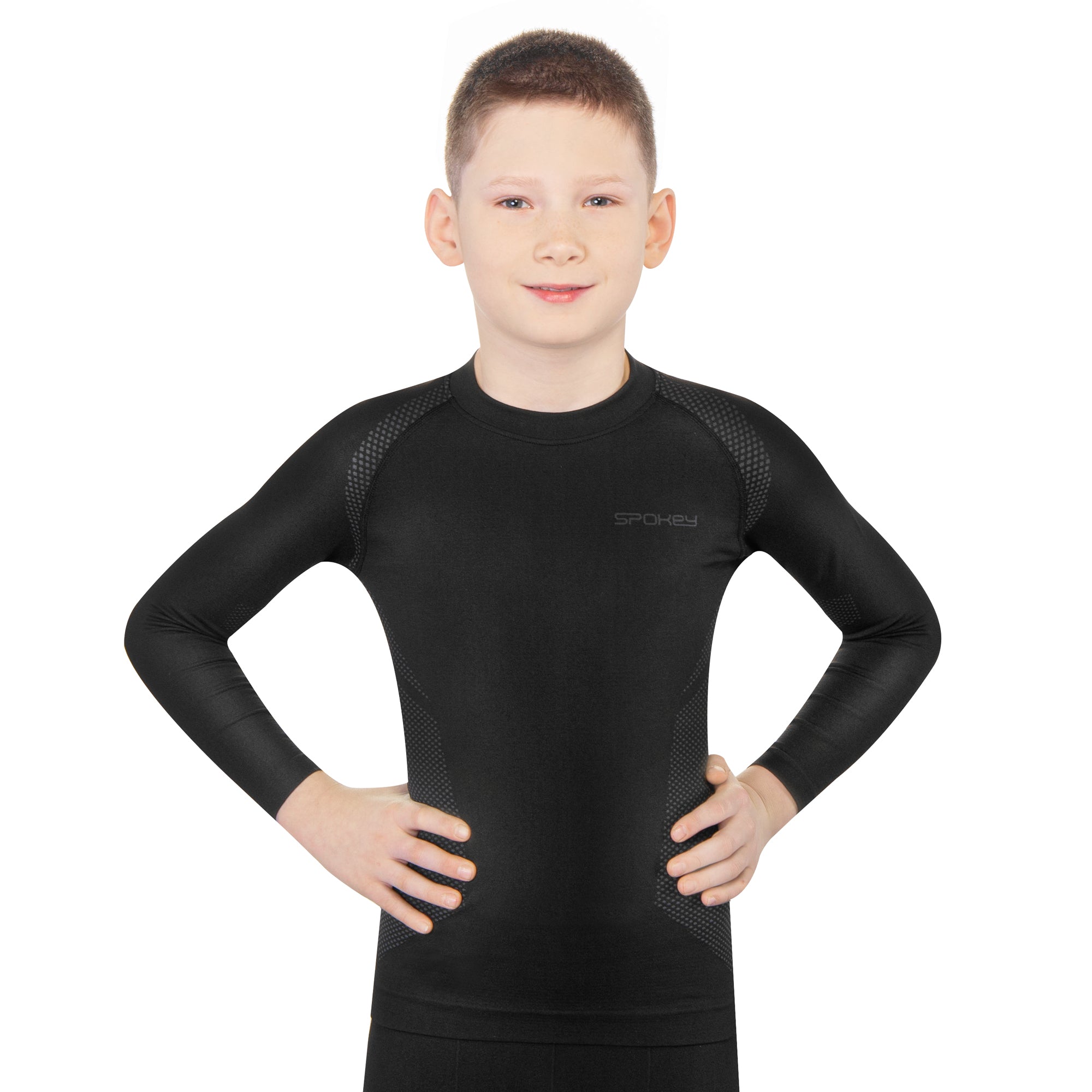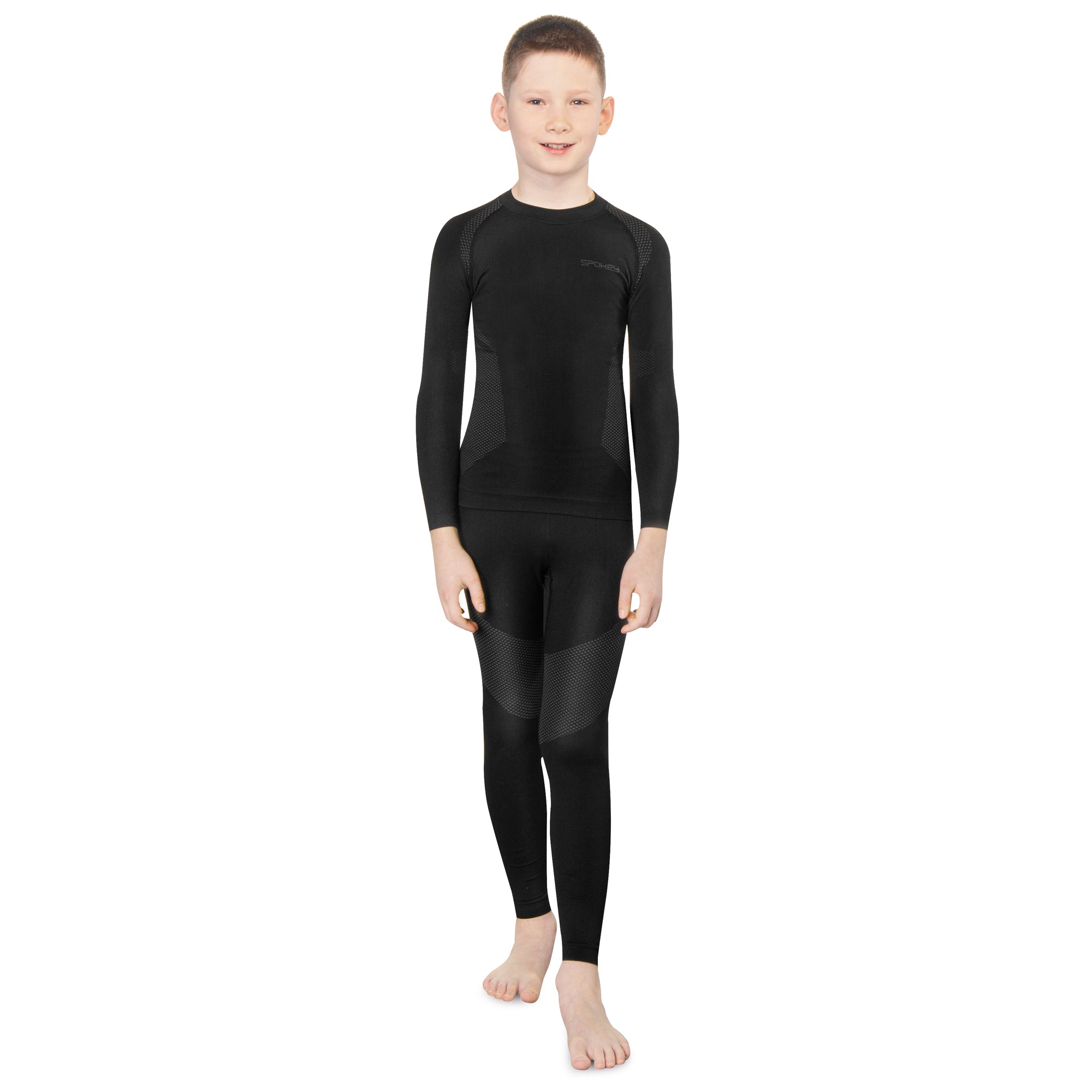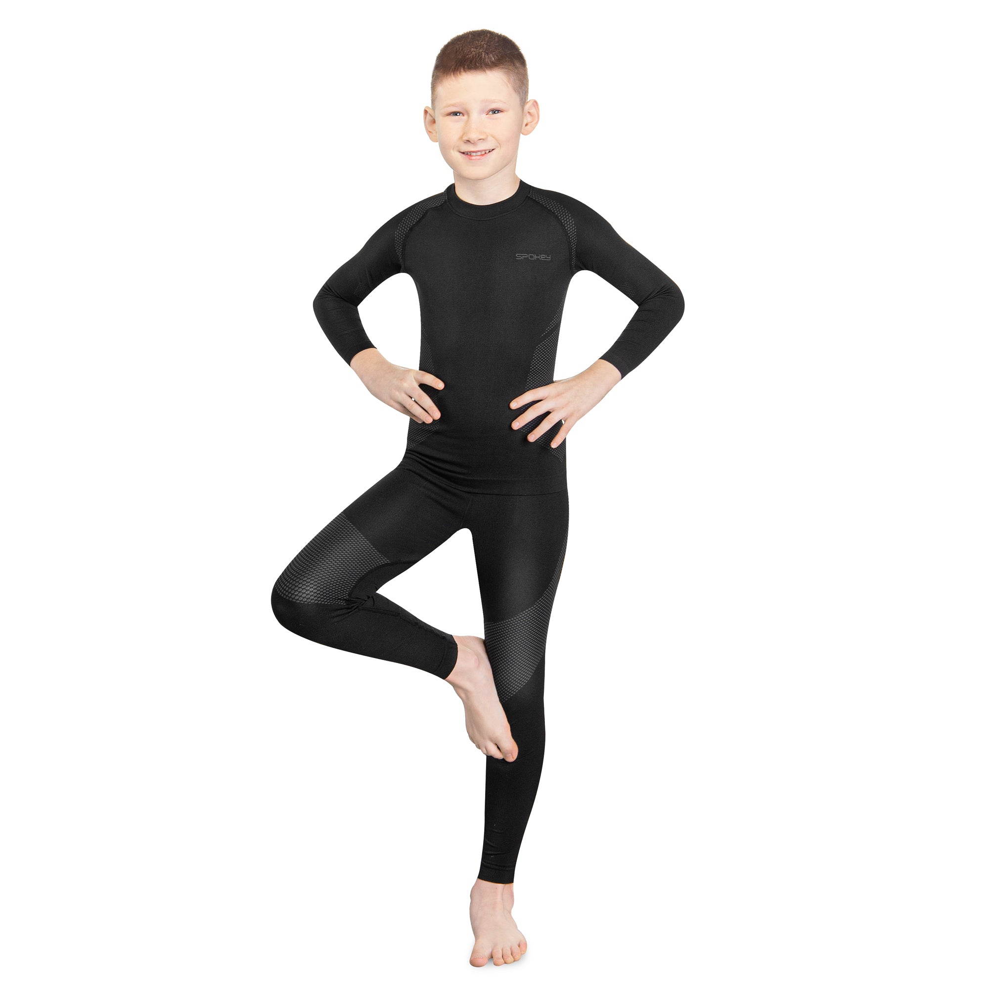 Ett set med barns underställ tillverkat av en mjuk och behaglig kombination av elastiska tyger som är motståndskraftiga mot rivning och tänjning. Den åtsittande passformen och de platta sömmarna ger full rörelsefrihet och skyddar mot skav. Materialet behåller effektivt kroppens värme och transporterar bort fukt från huden. Produkten är avsedd som ett baslager för alla typer av vinteraktiviteter vid låga temperaturer.